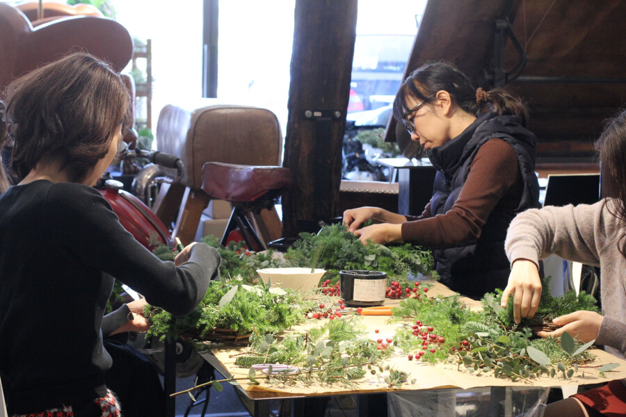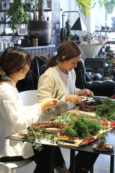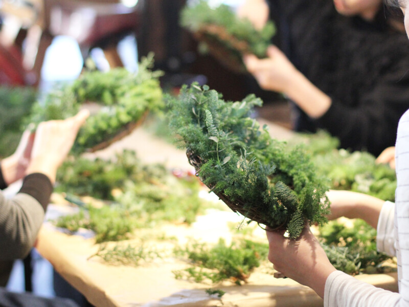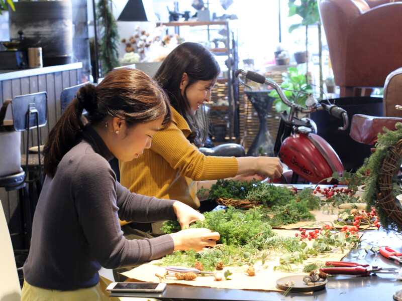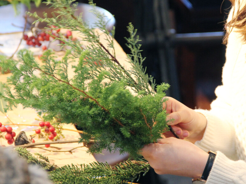 クリスマスアレンジならではのモミやヒロムスギなどグリーンの香りが漂う店内で、夢中で作るうちにあっという間に完成。