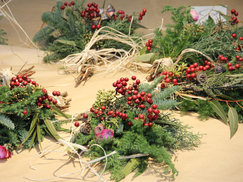 このワークショップで作っていただいたクリスマスリースやスワッグは、そのまま水やりをすることなくクリスマスまで飾っていただけます。
