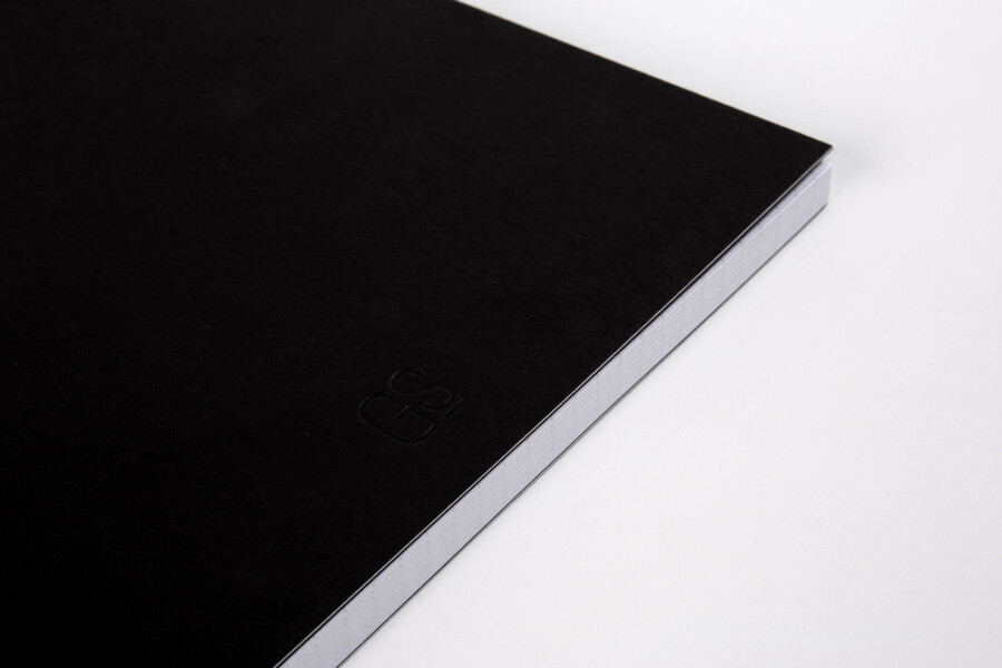 ブラック&ホワイトのミニマルなデザイン。表紙には「GS」のロゴがエンボスでワンポイント。